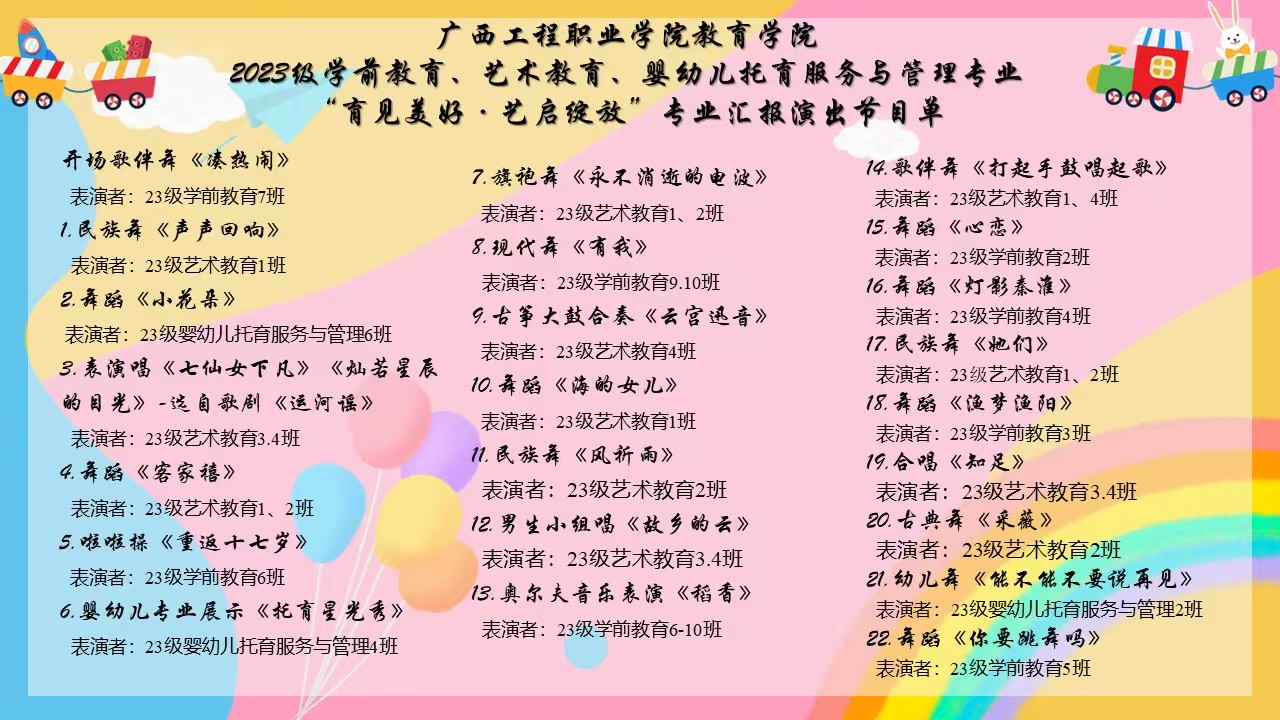 2025年6月25日,廣西工程職業(yè)學(xué)院教育學(xué)院 2023 級(jí)學(xué)前教育、藝術(shù)教育、嬰幼兒托育服務(wù)與管理專業(yè) “育見美好?藝啟綻放” 匯報(bào)演出在學(xué)校體育館圓滿落幕。學(xué)校領(lǐng)導(dǎo)、學(xué)院全體教師及 2023 級(jí)、2024級(jí)全體學(xué)生共同見證了這場(chǎng)充滿青春活力與專業(yè)風(fēng)采的視聽舞臺(tái)。