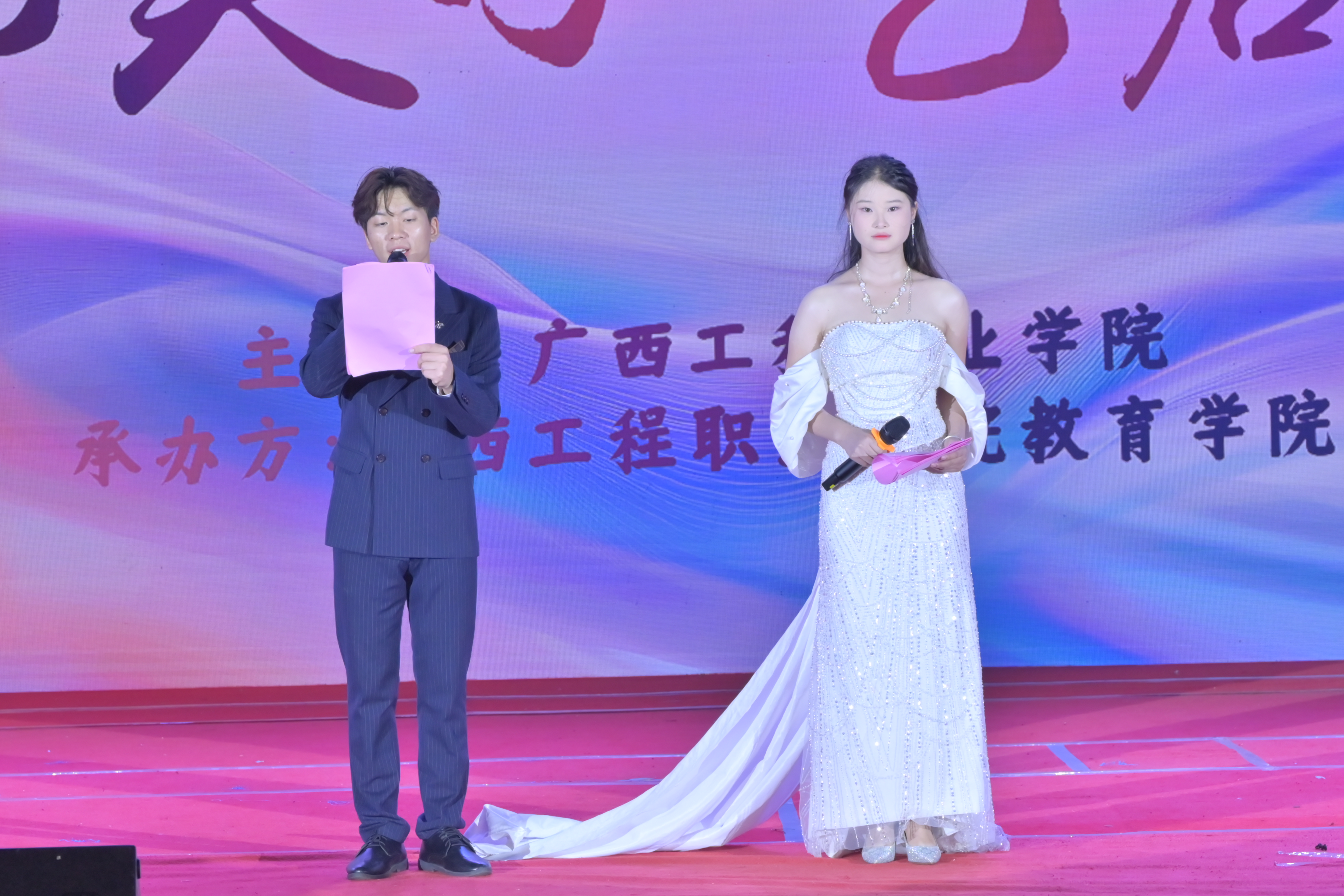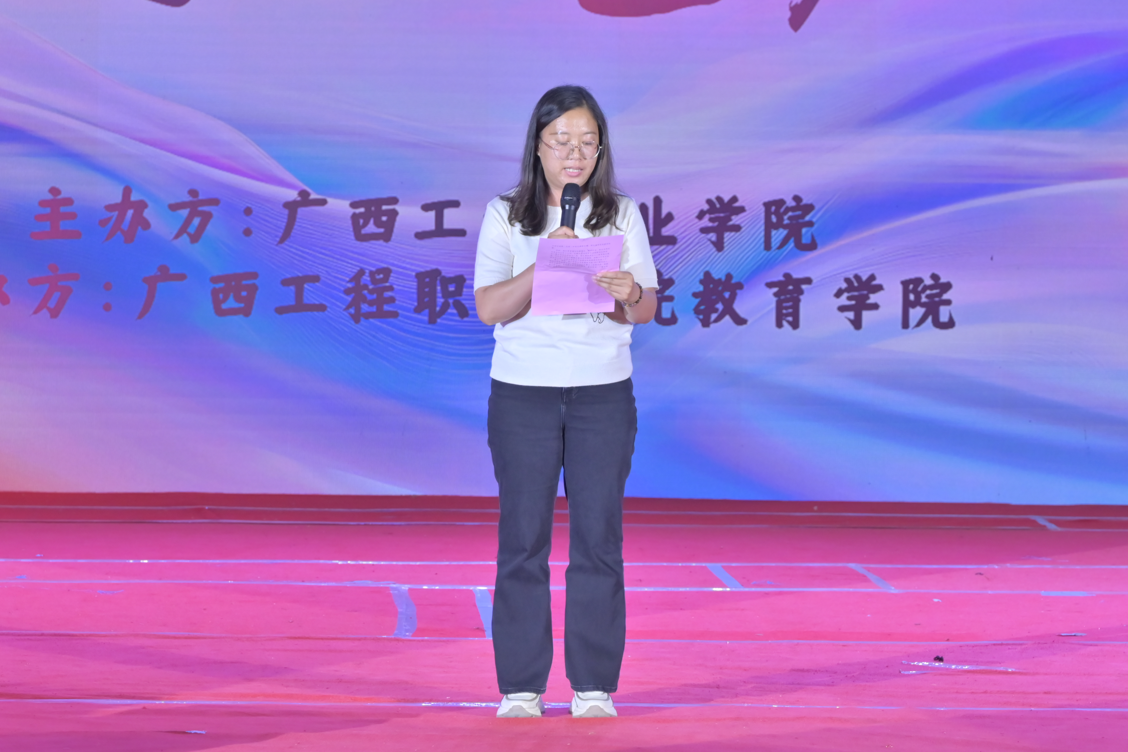 教育學(xué)院院長胡星萍致辭。她表示,在這充滿希望與活力的美好時(shí)節(jié),我們齊聚廣西工程職業(yè)學(xué)院體育館,共同迎來教育學(xué)院2023 級(jí)學(xué)前教育、藝術(shù)教育、嬰幼兒托育服務(wù)與管理專業(yè)“育見美好?藝啟綻放”教學(xué)成果匯報(bào)展演。本次匯報(bào)演出,是教育學(xué)院落實(shí)專業(yè)人才培養(yǎng)目標(biāo)的重要實(shí)踐,也是對(duì)2023級(jí)學(xué)子學(xué)習(xí)成果的全面檢驗(yàn),有著多重深遠(yuǎn)目的。對(duì)學(xué)生而言,這是一個(gè)將課堂所學(xué)轉(zhuǎn)化為實(shí)踐成果的絕佳平臺(tái)。通過舞臺(tái)表演、技能展示等多元形式,不僅能全面檢驗(yàn)他們?cè)趯I(yè)理論知識(shí)、藝術(shù)技能、保教實(shí)踐等方面的學(xué)習(xí)成效,還能鍛煉他們的舞臺(tái)表現(xiàn)力、團(tuán)隊(duì)協(xié)作能力和臨場(chǎng)應(yīng)變能力,為未來踏入職場(chǎng)積累寶貴經(jīng)驗(yàn)。每一個(gè)節(jié)目從構(gòu)思到成型,每一次排練從生疏到嫻熟,都凝聚著同學(xué)們的智慧與堅(jiān)持。從專業(yè)發(fā)展角度出發(fā),此次活動(dòng)能夠充分彰顯教育學(xué)院這三大專業(yè)的特色與優(yōu)勢(shì)。每一個(gè)節(jié)目、每一次展示,都是專業(yè)教學(xué)成果的生動(dòng)體現(xiàn),讓我們清晰看到專業(yè)人才培養(yǎng)的方向與成果,為進(jìn)一步優(yōu)化課程設(shè)置、深化教學(xué)改革提供依據(jù)。此外,希望通過這場(chǎng)演出,增進(jìn)社會(huì)、家長及師生對(duì)專業(yè)的認(rèn)知與認(rèn)同。打破外界對(duì)這些專業(yè)的固有認(rèn)知誤區(qū),展示專業(yè)的深度與廣度,吸引更多有志之士投身相關(guān)領(lǐng)域,同時(shí)也為深化產(chǎn)教融合奠定堅(jiān)實(shí)基礎(chǔ),加強(qiáng)與行業(yè)企業(yè)的溝通合作,培養(yǎng)出更貼合市場(chǎng)需求的高素質(zhì)應(yīng)用型人才。