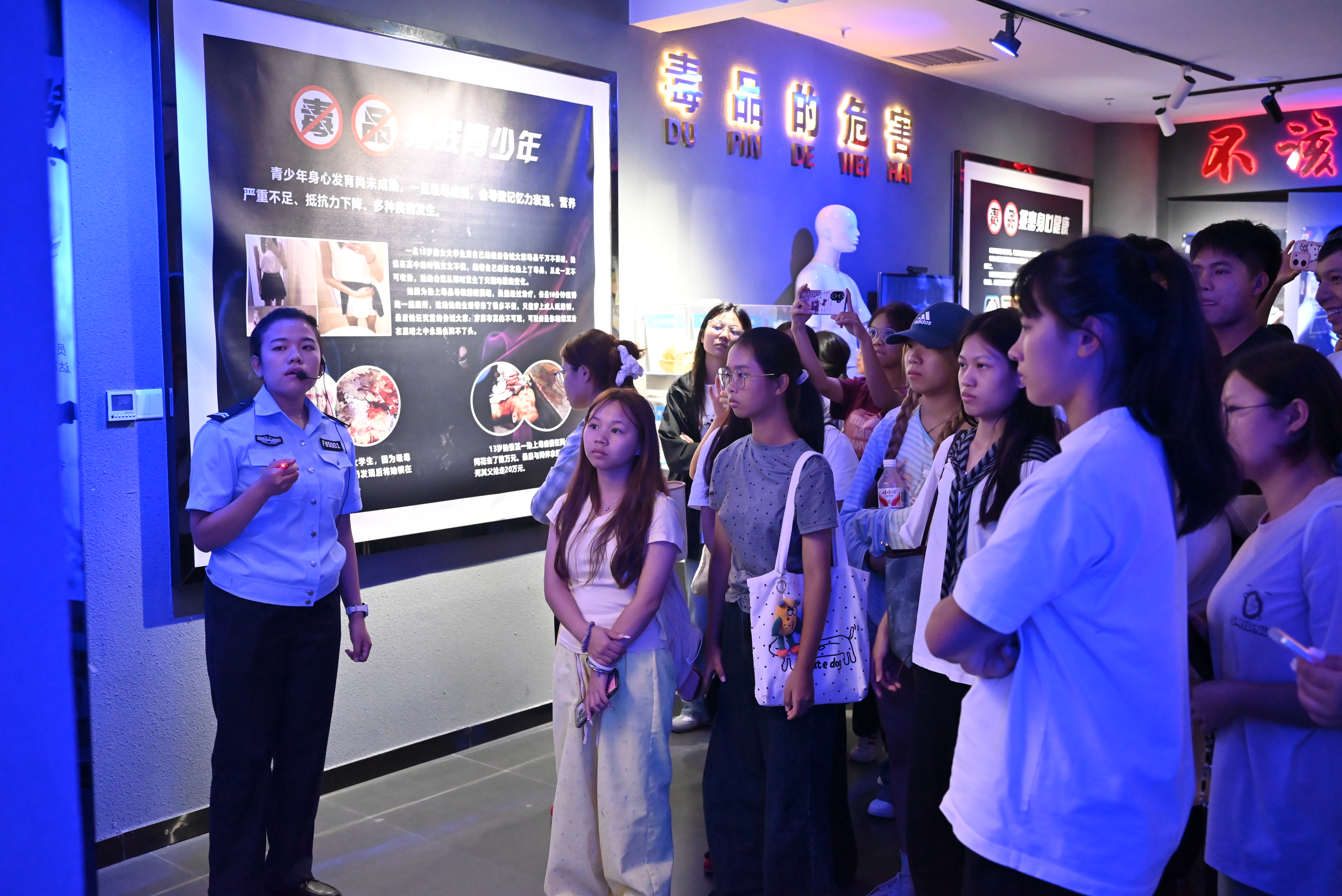 活動伊始,在基地解說員的帶領(lǐng)下,學(xué)生們有序參觀了禁毒知識展示區(qū)。解說員結(jié)合詳實的文字資料、生動的圖片案例以及仿真毒品模型,從毒品的種類、形態(tài)、危害等方面進行了系統(tǒng)講解,詳細闡述了毒品對個人身體健康、家庭幸福以及社會安定的嚴重破壞,讓學(xué)生們對毒品有了更為直觀和深刻的認識。解說員系統(tǒng)地向同學(xué)們講解了傳統(tǒng)毒品、新型毒品、合成毒品等各類毒品,特別指出現(xiàn)今一些毒品被巧妙包裝成“彩虹糖”“冰糖”“奶茶杯”等外形,隱蔽性更強、危害性更大,若不仔細辨別,很容易讓人陷入其陷阱。一個個觸目驚心的案例,讓現(xiàn)場學(xué)生深感毒品危害的嚴重性,也進一步增強了他們遠離毒品的決心。