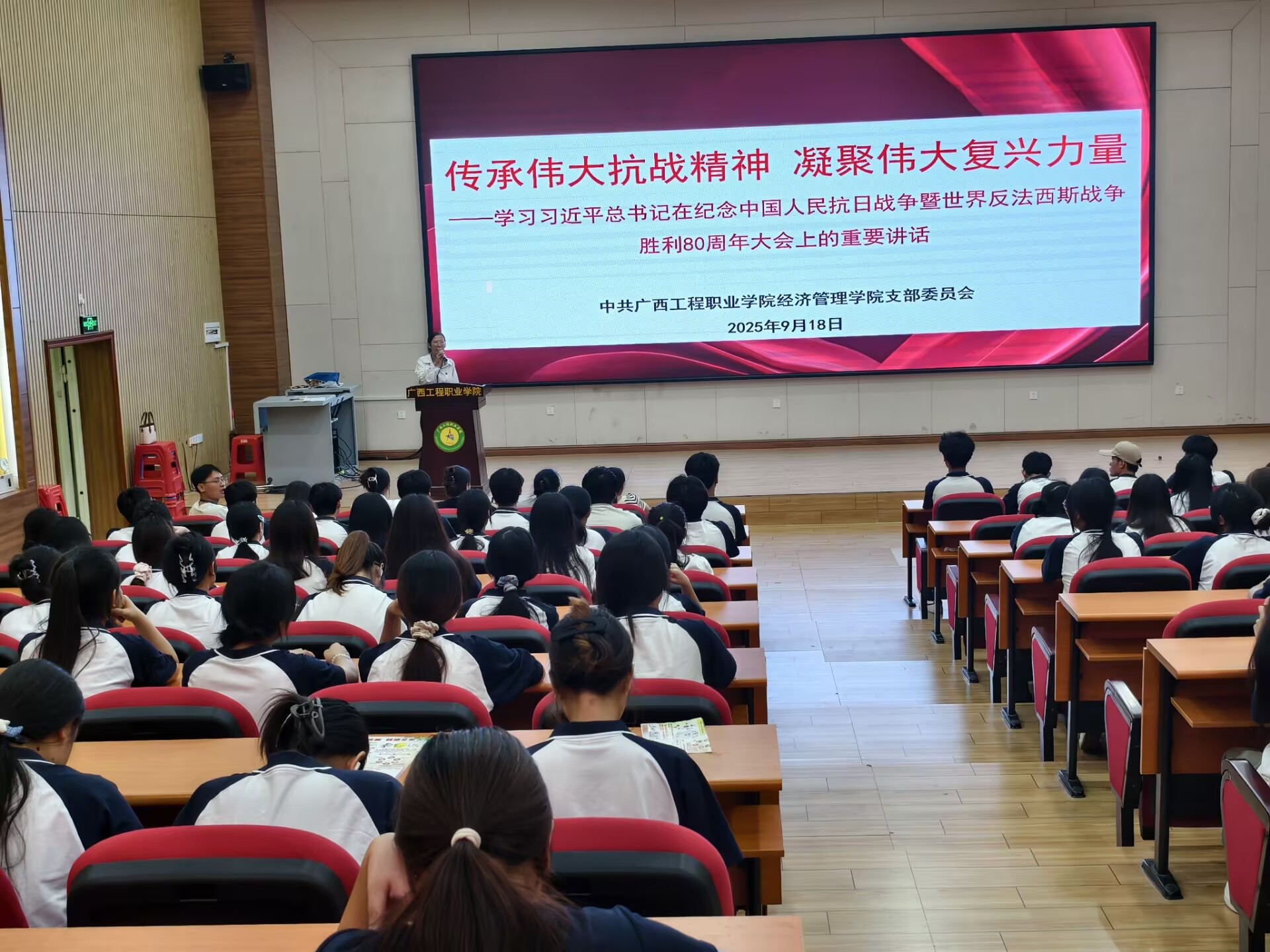 在這個(gè)特別的日子,結(jié)合9月3日的祖國(guó)大閱兵活動(dòng)。經(jīng)濟(jì)管理學(xué)院黨支部書記覃清香開(kāi)展“傳承偉大抗戰(zhàn)精神 凝聚偉大復(fù)興力量”的微黨課活動(dòng),主要學(xué)習(xí)習(xí)近平總書記在紀(jì)念中國(guó)人民抗日戰(zhàn)爭(zhēng)暨世界反法西斯戰(zhàn)爭(zhēng)勝利80周年大會(huì)上的重要講話。她通過(guò)圍繞銘記歷史,以史為鑒,從抗戰(zhàn)記憶中汲前行智慧,在艱苦卓絕的抗戰(zhàn)進(jìn)程中,感悟和弘揚(yáng)偉大抗戰(zhàn)精神,激發(fā)師生們的愛(ài)國(guó)主義情懷,強(qiáng)化青年肩負(fù)民族復(fù)興重任的責(zé)任感與使命感,為實(shí)現(xiàn)社會(huì)主義現(xiàn)代化與中華民族的偉大復(fù)興貢獻(xiàn)自己的青春力量。
