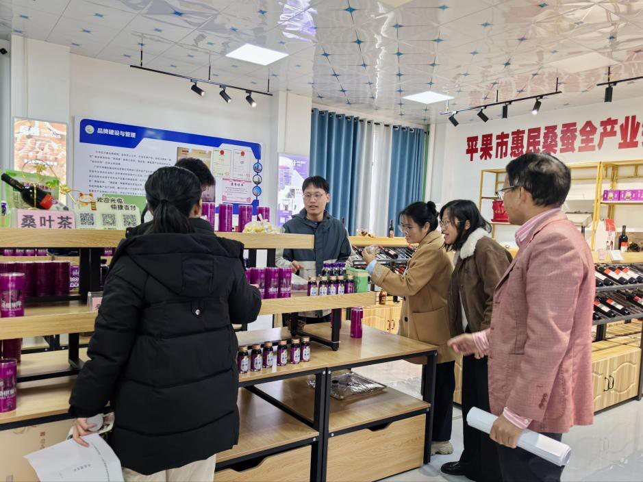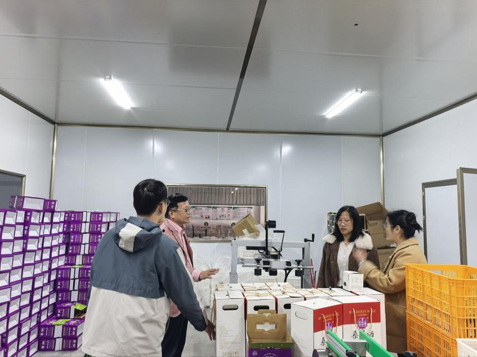 簽約儀式結(jié)束后,在韓冀飛董事長的帶領(lǐng)下,覃清香院長一行人先后參觀了企業(yè)的生產(chǎn)線和直播間。在生產(chǎn)車間,大家詳細(xì)了解了蠶業(yè)產(chǎn)品和桑果酒的生產(chǎn)流程、質(zhì)量管控等環(huán)節(jié);在直播間,企業(yè)工作人員介紹了當(dāng)前產(chǎn)品的網(wǎng)絡(luò)營銷模式、直播帶貨技巧及銷售業(yè)績等情況。參觀過程中,師生們認(rèn)真聆聽、積極提問,對(duì)企業(yè)的生產(chǎn)運(yùn)營和行業(yè)發(fā)展有了更直觀、深入的認(rèn)識(shí)。
