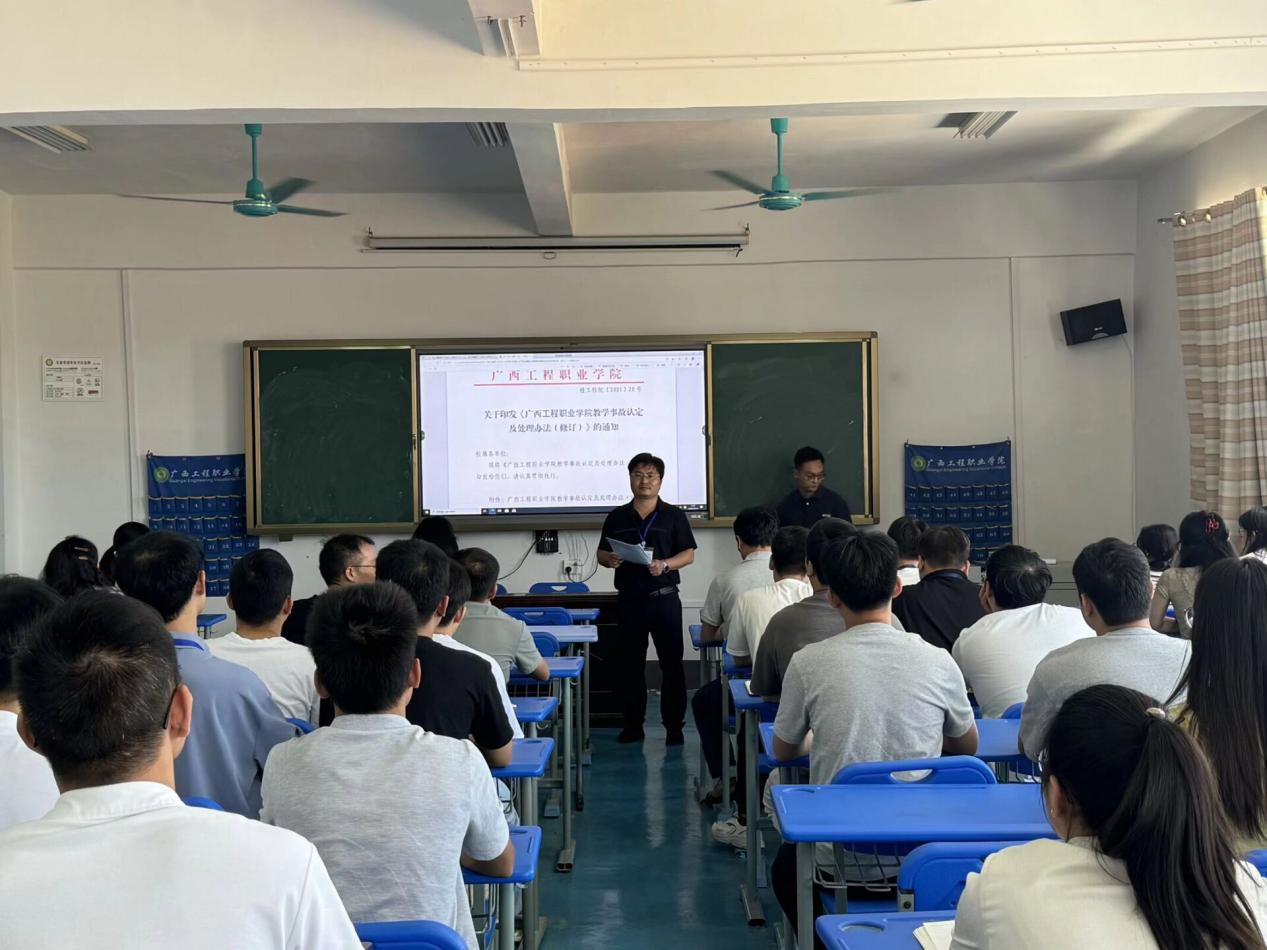 針對(duì)教學(xué)事故界定與分類,院長對(duì)照《廣西工程職業(yè)學(xué)院教學(xué)事故認(rèn)定與處理辦法》,以“案例+解讀”的方式,清晰梳理了課堂教學(xué)、教學(xué)安排、成績(jī)管理、考試組織等環(huán)節(jié)中可能出現(xiàn)的教學(xué)事故類型,逐一明確事故等級(jí)劃分標(biāo)準(zhǔn)與對(duì)應(yīng)的處理流程,同時(shí),他特別指出,部分“隱性教學(xué)事故”(如教學(xué)方法單一導(dǎo)致學(xué)生參與度低等),雖不易察覺,卻直接影響教學(xué)效果,需引起全體教職工的高度重視。